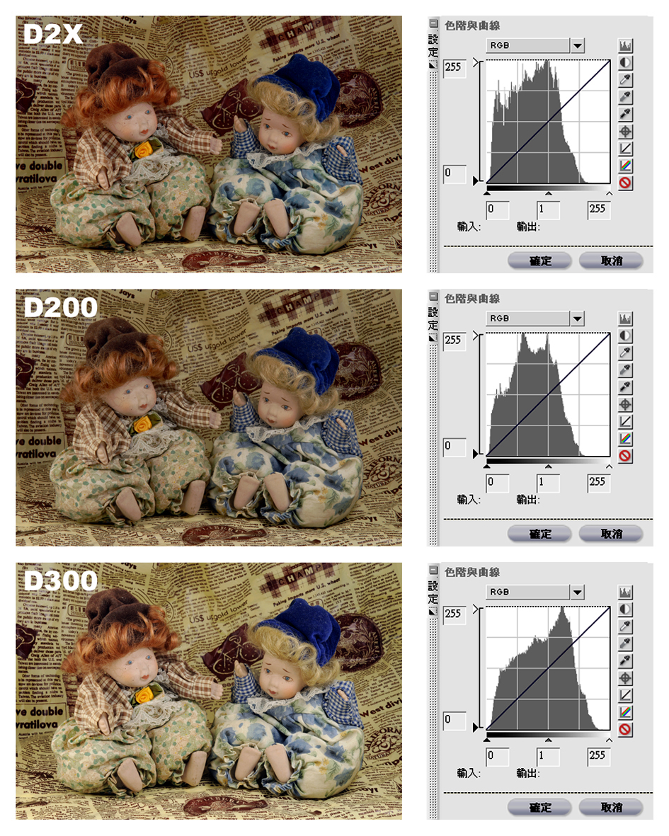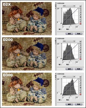 色彩和曝光表現上,使用D300與D2X、D200等機身搭配AF-S 17-55mm F2.8G鏡頭,選擇Adobe RGB色彩模式,對比、亮度、飽和度、色相等條件均設定為中間值,拍攝同一主題。以Nikon Capture NX(色彩空間設定為Nikon Adobe RGB 4.0.0.3000)開啟影像,可看出D300所拍影像感覺較為鮮活明亮,與D2X或D200的稍偏保守暗調有明顯區別。